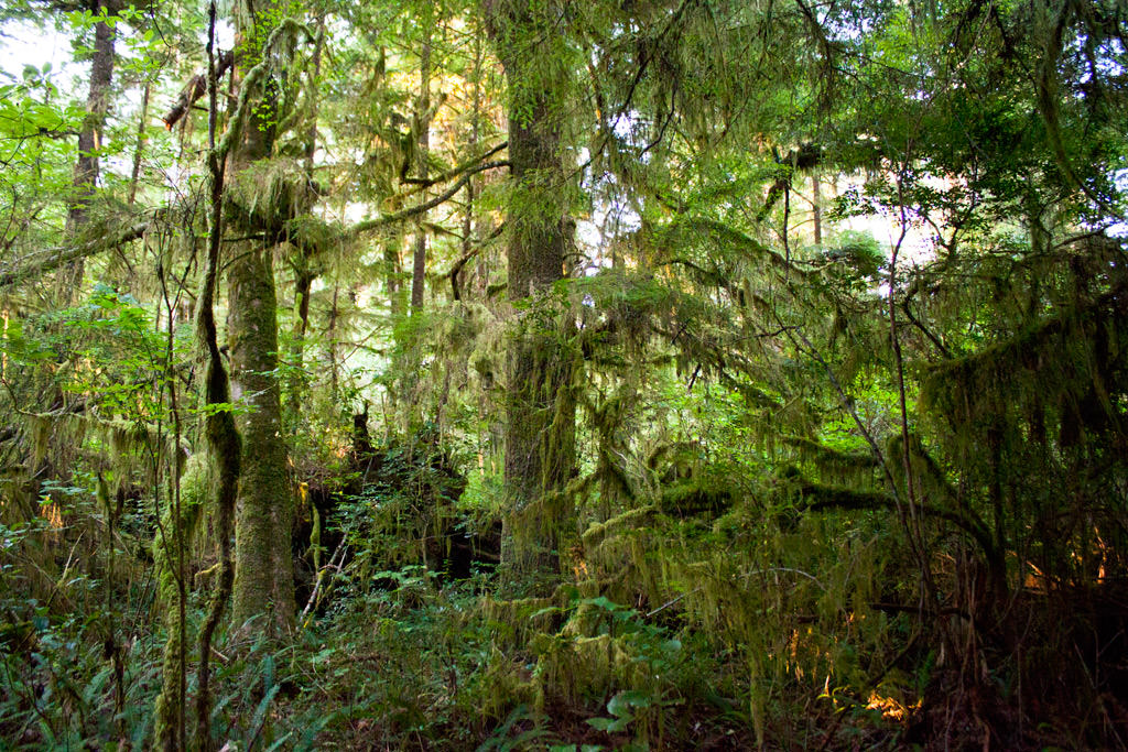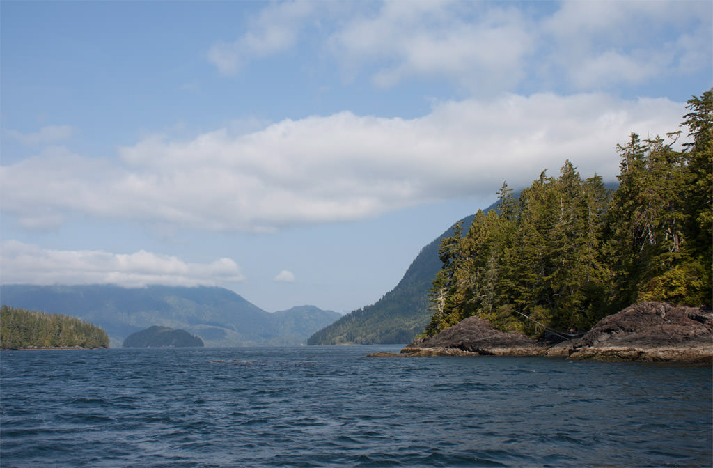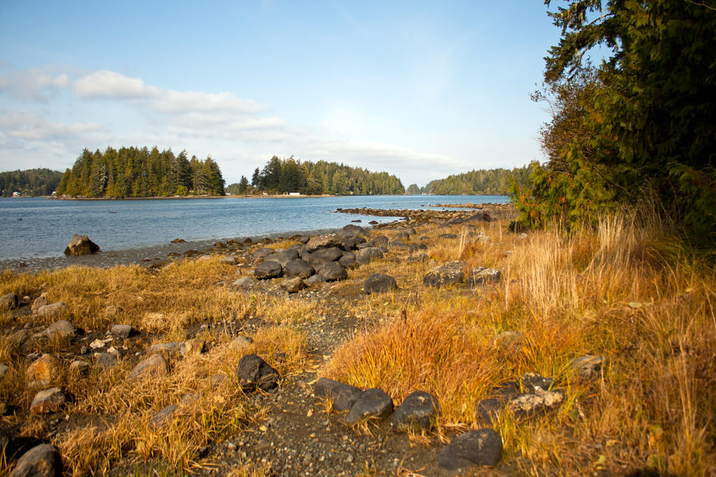 Much of the trail is similar terrain and can often be very muddy. After hiking about 2km from the Hanging Tree, the trail descends quickly down a hill where there are some short trails on the left that lead to a beach. Follow these short trails and emerge from the forest for some scenic views of Clayoquot Sound from the southwestern tip of Meares Island.