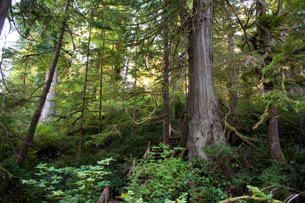 Located on Meares Island, the Big Tree Trail has some of the largest trees in British Columbia. The old-growth forest consists of spruce, hemlock, and western cedar trees that are more than 1,000 years old, with the largest tree known as the Hanging Garden.