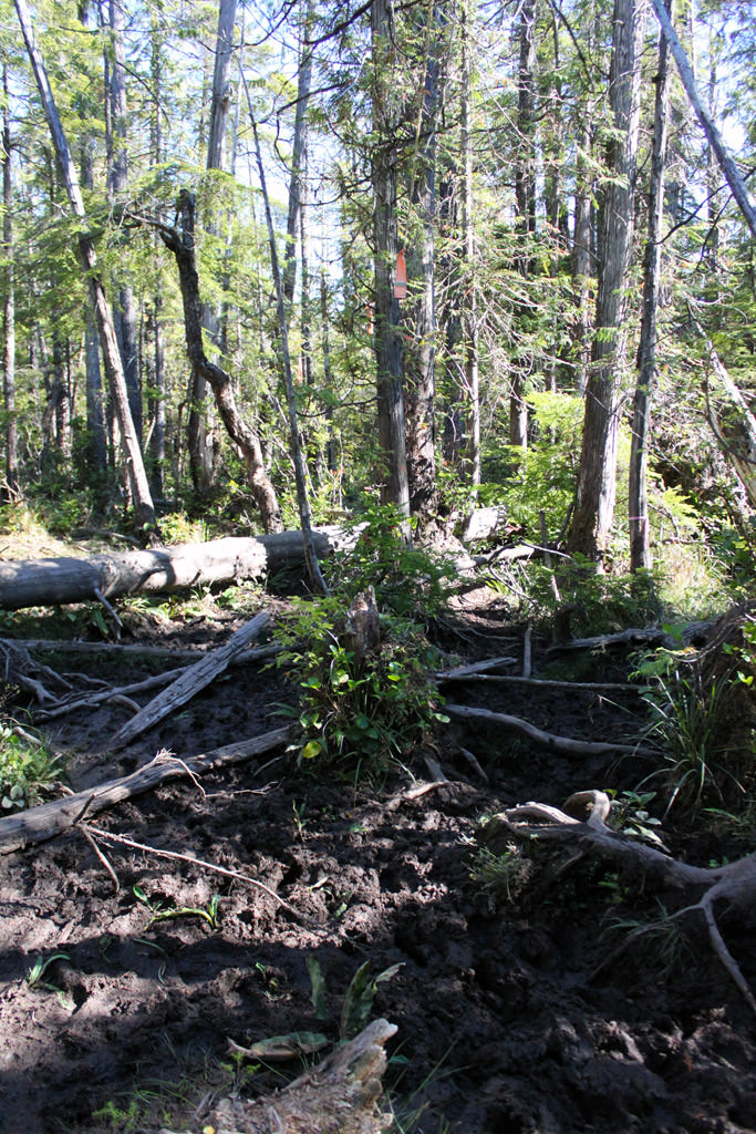 Continue following the markers through the muddy bog. There are several different coloured markers and the string on the trees marks the boundaries of the trail area, all lead in the same general direction. The trail eventually becomes less muddy as you find yourself walking through a section of rugged, coastal trees.
